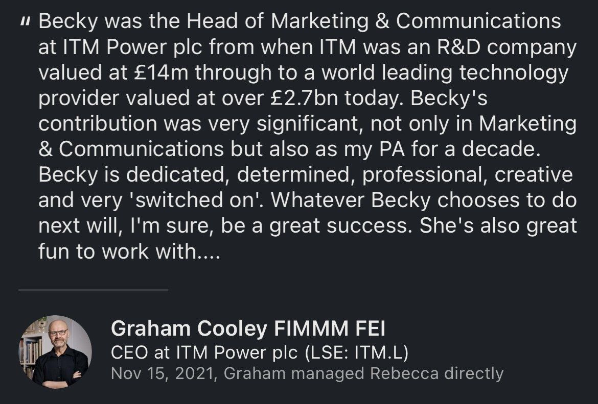 “Rebecca is great to work with, highly skilled in marketing, high impact corporate/ public relations and strategic communications.”