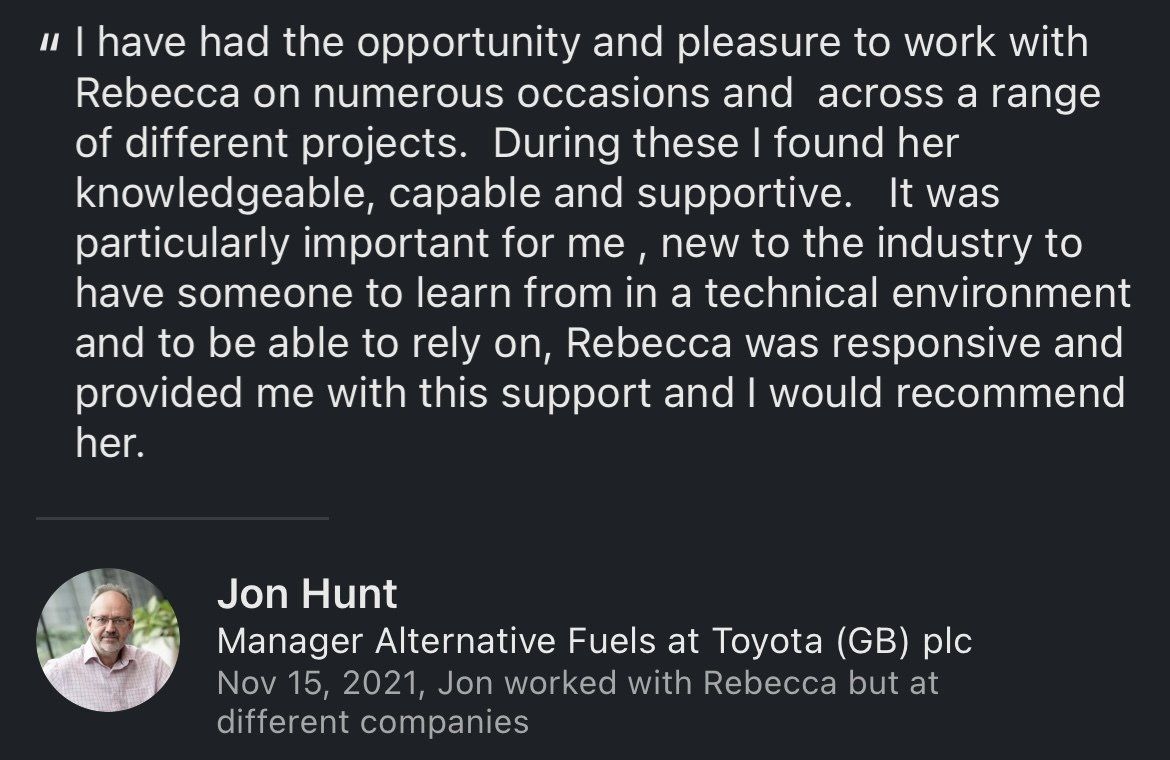Rebecca has worked in the Energy and Environmental sector, mainly in hydrogen, for a number of years, from when the sector was hardly recognised up until recently, where it is a growing billion pound industry.